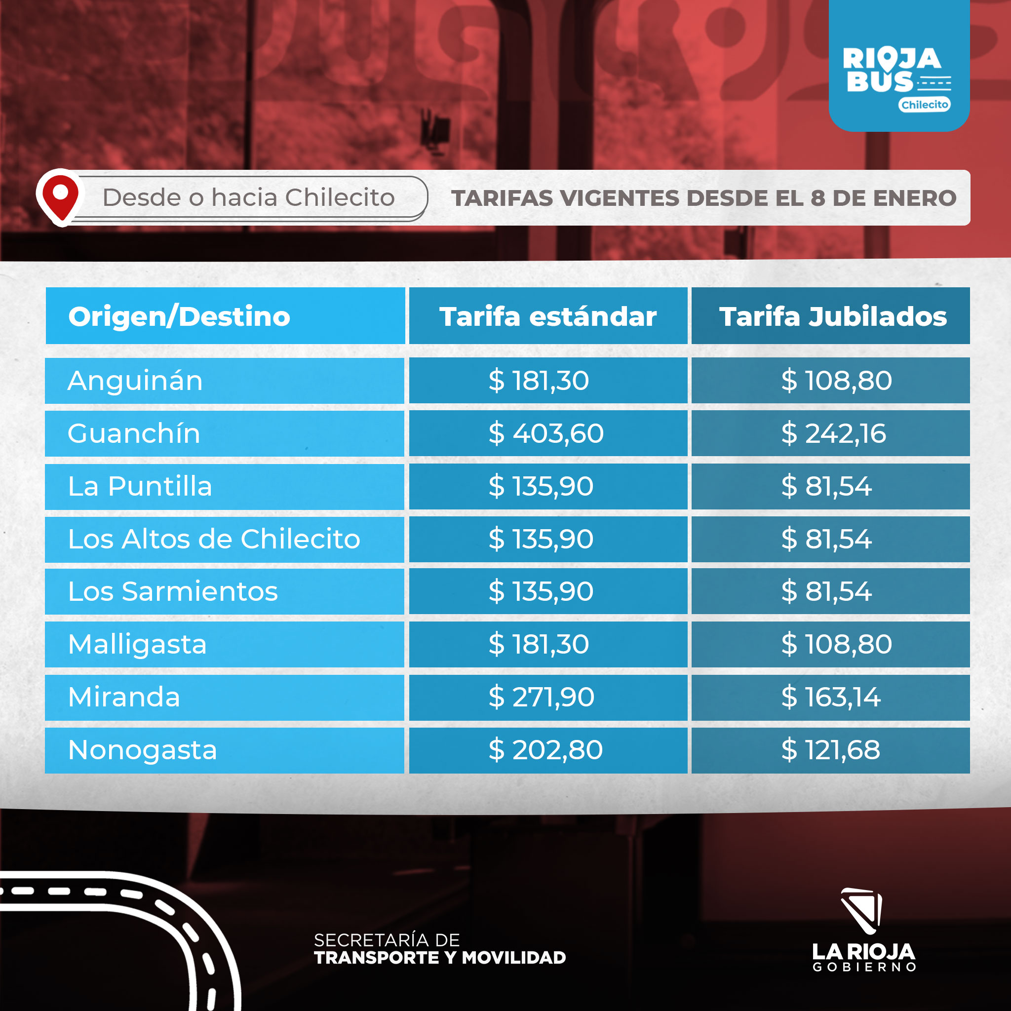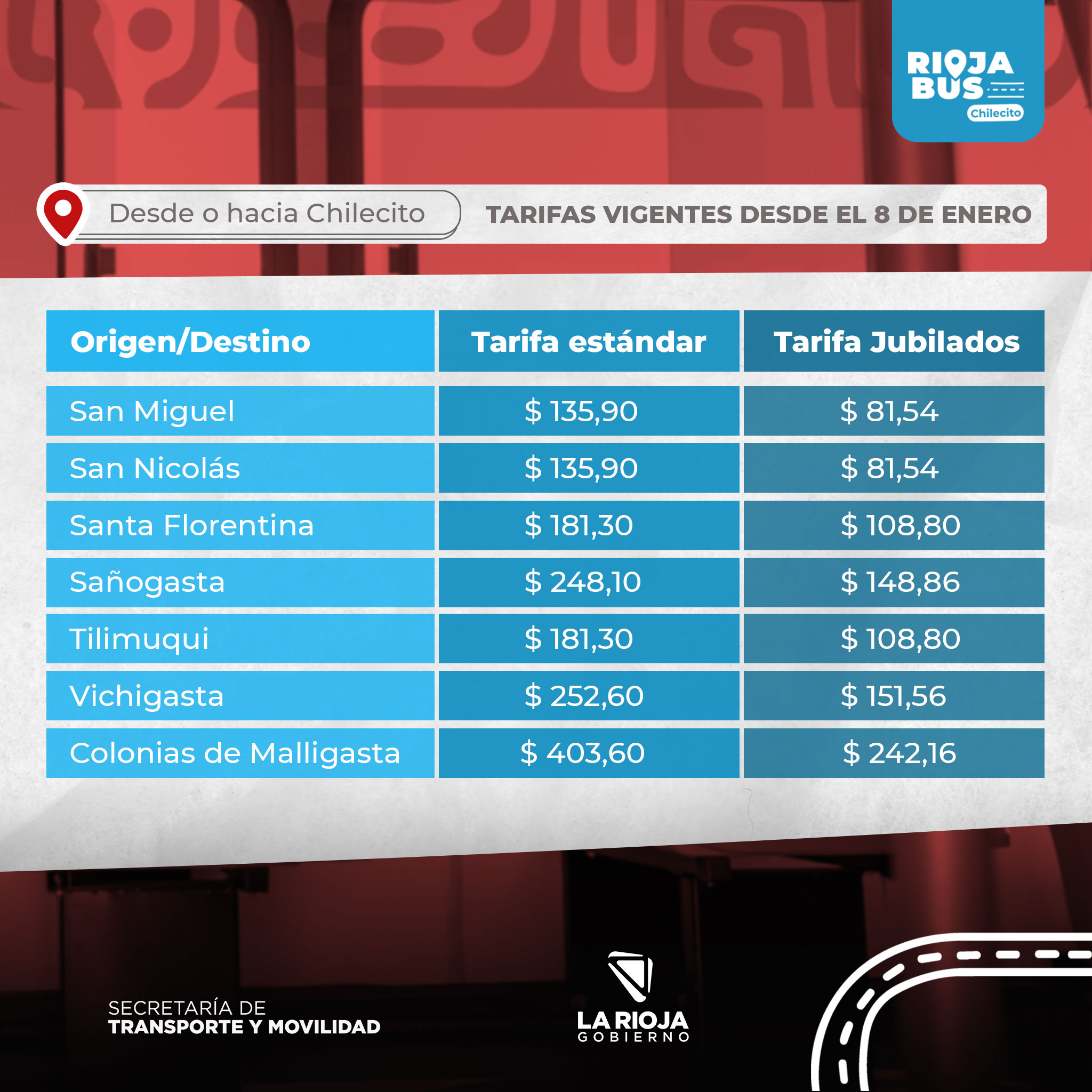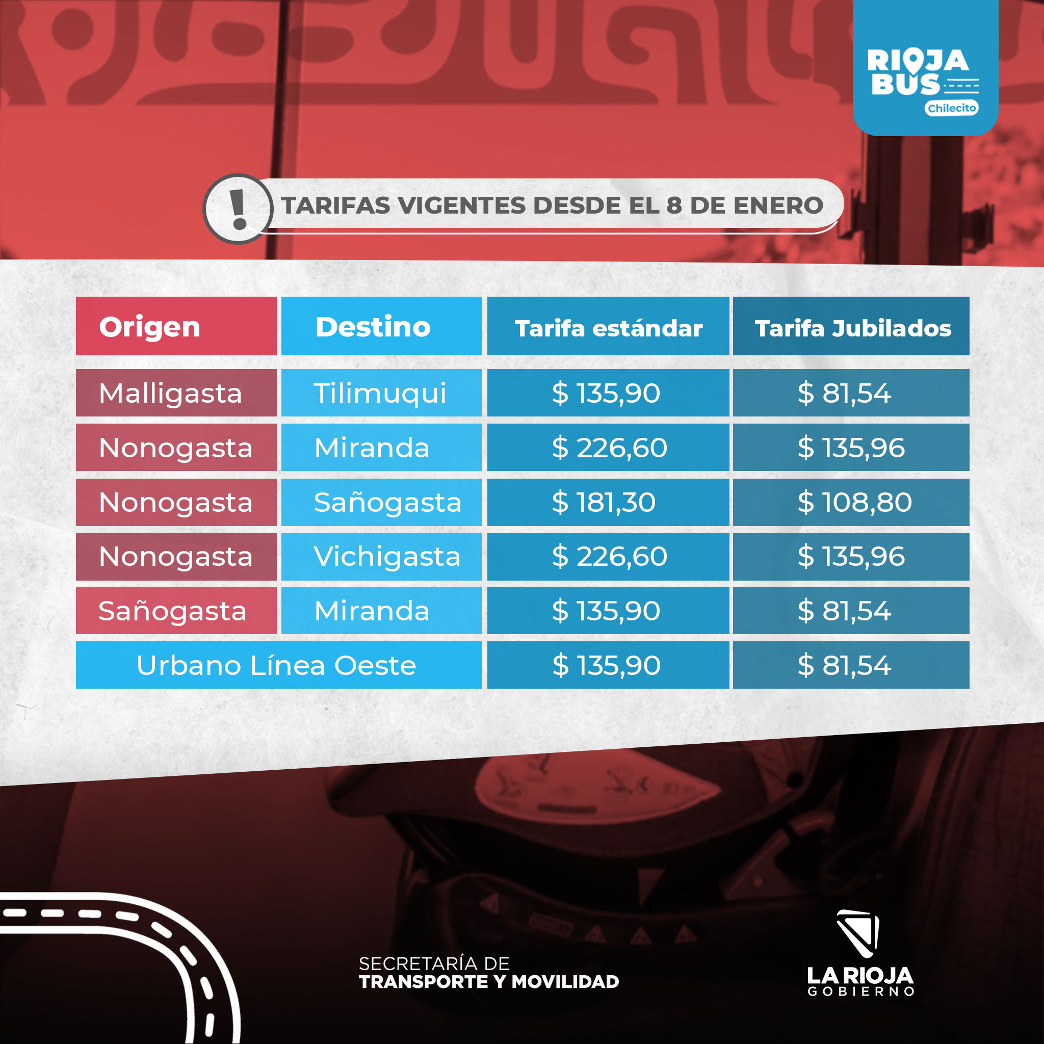 A través de comunicado en redes sociales, la empresa RiojaBus, informó que rige el nuevo cuadro tarifario de transporte urbano para el departamento Chilecito.